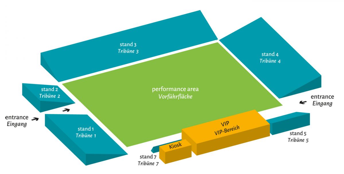 The Casino Stadium in Bregenz has a 6,800 sqm playing area, with seating for 2,600 (1,000 seats are roofed) and terraces for 7,600. It is located near the railway station, the lake and the city centre and so fulfils many requirements of the Large Group Performances taking place there.