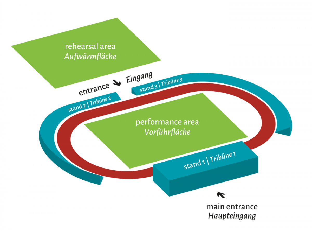 The size of the performance area is planned to be mainly in the range of 14 m x 14 m. The external dimenions of the City Performance stages will therefore be in the range of 16 m x 16 m with an average height of 50 – 80 cm and a roofing height of 6 – 8 m. The stages will be completely covered to have both rain protection as well as sunscreens. At least two stages are planned to be equipped with a particular number of gymnastics apparatus. With such general set-up we hope that – just as in 2007 – as many groups as possible make use of the opportunity to present one or more shows on a City Performance stage.
