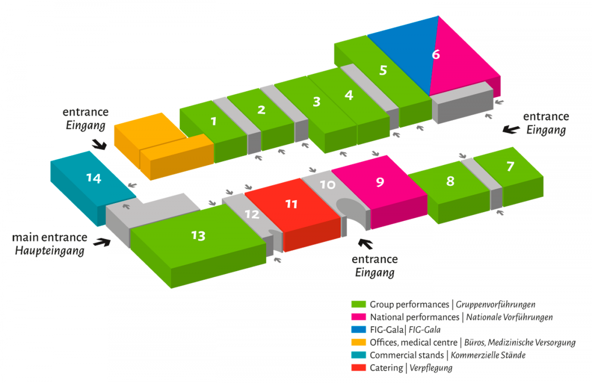 The Dornbirn Trade Exhibition centre is the heart of the Gymnaestrada, as here all Group Performances, the National Performances and the FIG Gala will take place.